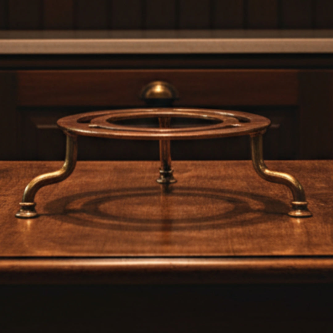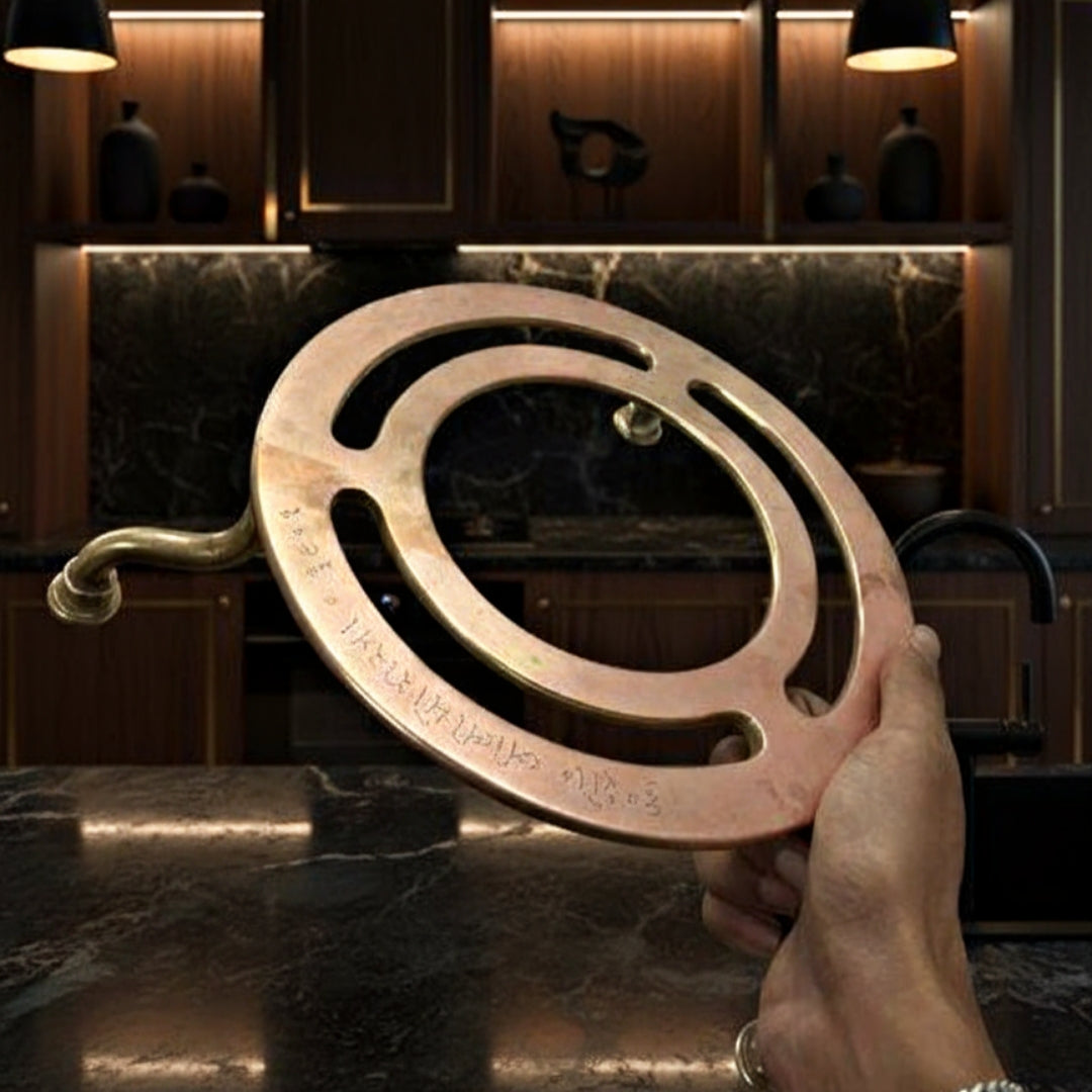 This 1901 antique brass utensil stand was traditionally used in Indian kitchens to support heavy vessels, pots, and serving bowls. Its strong circular frame and weighty build offer both stability and durability, while the aged brass patina reflects its century-old heritage and timeless charm. A perfect blend of function and history, it carries the essence of old Indian kitchen craftsmanship.
