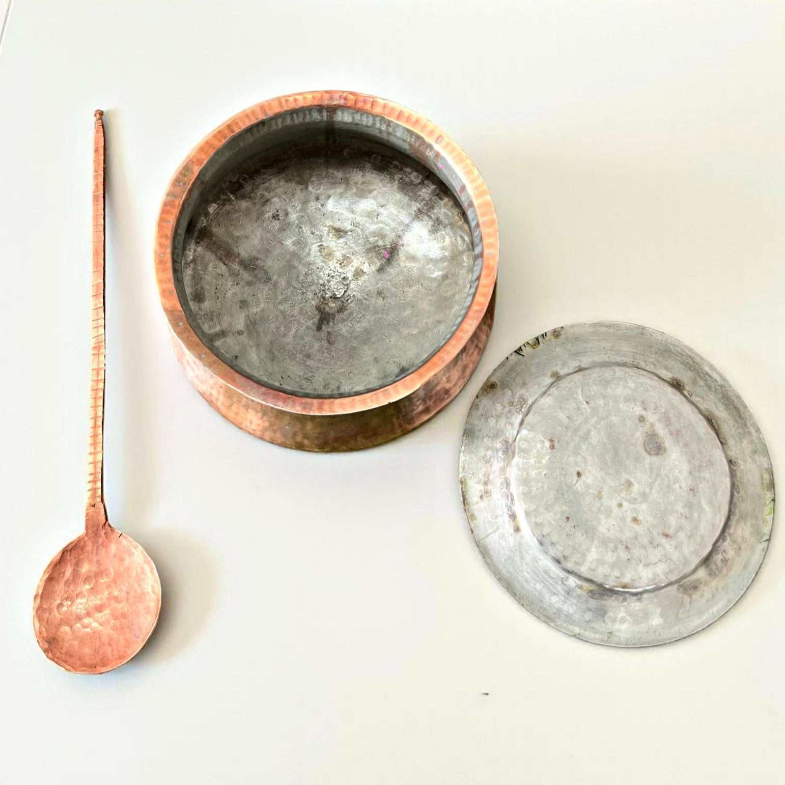 A 1965 antique copper cooking deg complete with its original lid and ladle, showcasing the charm of mid-century Indian kitchenware. The naturally aged patina and solid craftsmanship highlight its authenticity and timeless appeal.