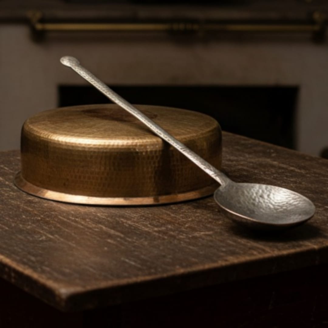 This 1966 antique brass patila comes paired with its original langadi, featuring a wide 4-litre form with clean shaping and a naturally aged patina. The smooth brass surface and gentle depth highlight its authenticity and well-preserved metal quality.