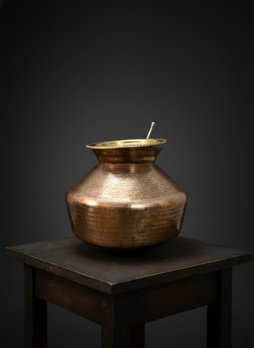 This 1972 antique brass cooking bowl with lid and ladle reflects the essence of traditional Indian cookware. Its rounded design, complemented by the matching lid and ladle, displays a warm brass sheen and the natural patina of time.
