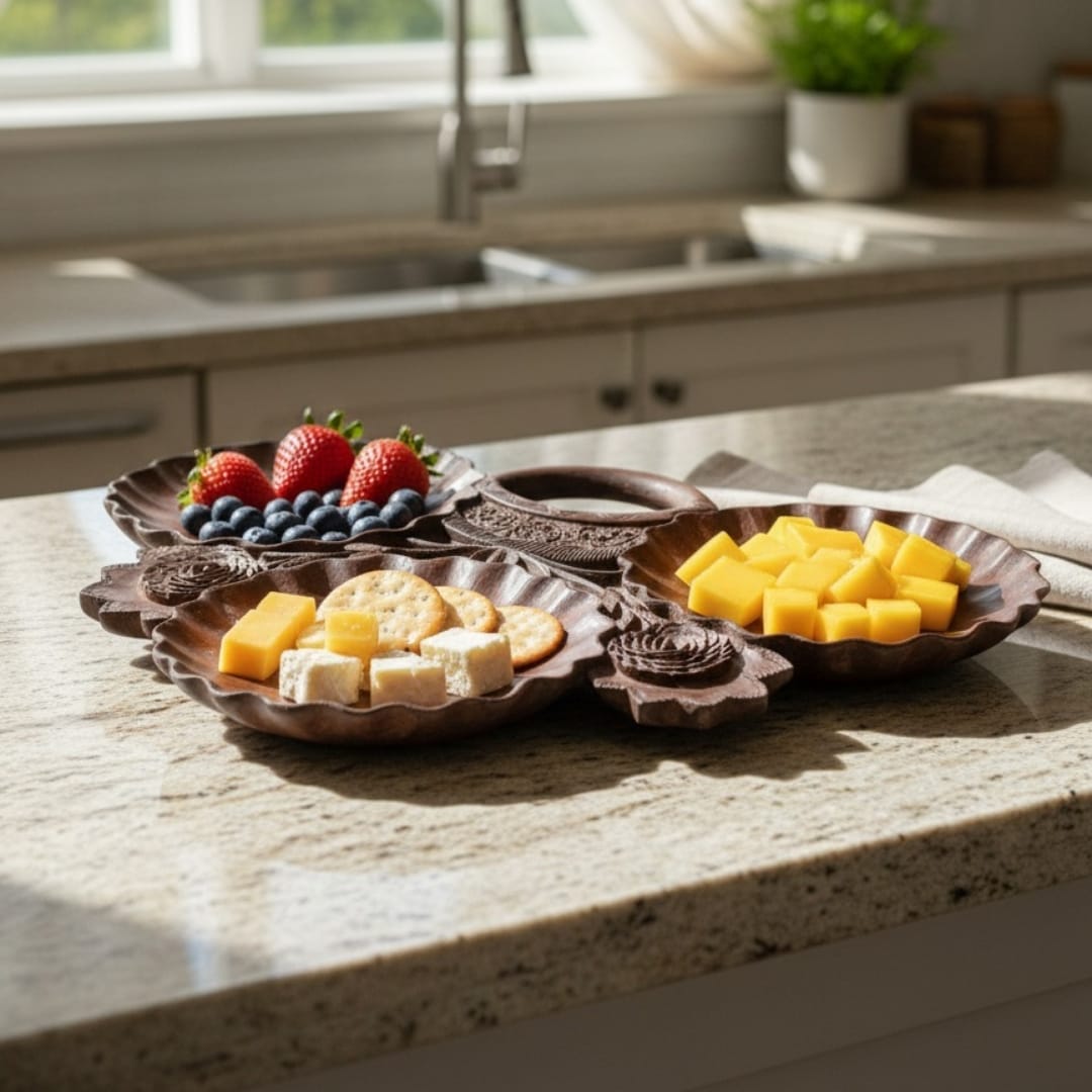 This rosewood tray works well for serving dry snacks, arranging cups, or organizing table essentials during everyday use. It can also be placed on coffee tables, consoles, or shelves as a decorative accent, where the engraved surface and warm rosewood finish add character and refinement to the setting.