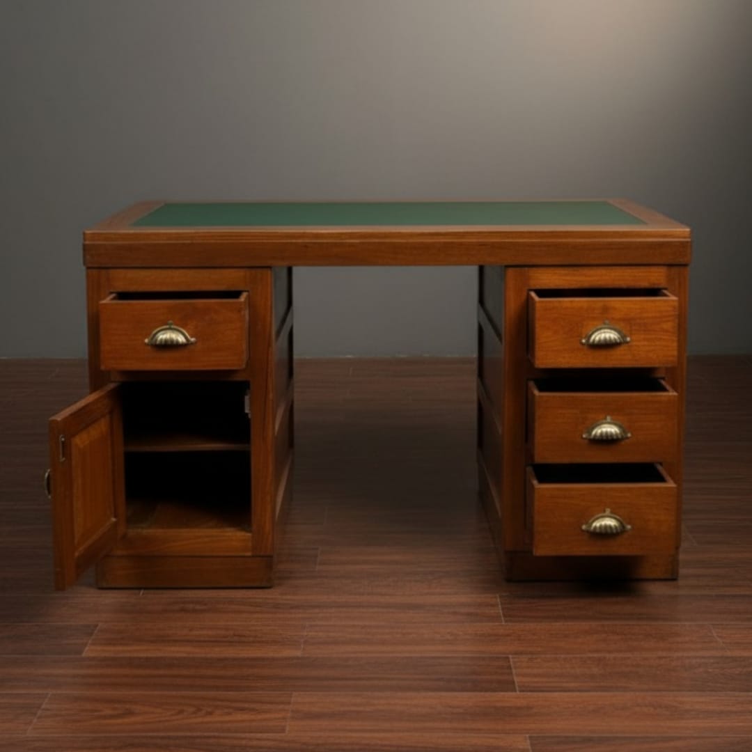 This desk works well as a writing or study table for home offices, libraries, or workspaces, providing ample surface area for books, laptops, and desk accessories. It can also be styled as a statement furniture piece in a living room or studio setting, where its solid build and classic lines bring character and warmth to the space. The drawer configuration allows practical storage of documents, stationery, and everyday essentials.