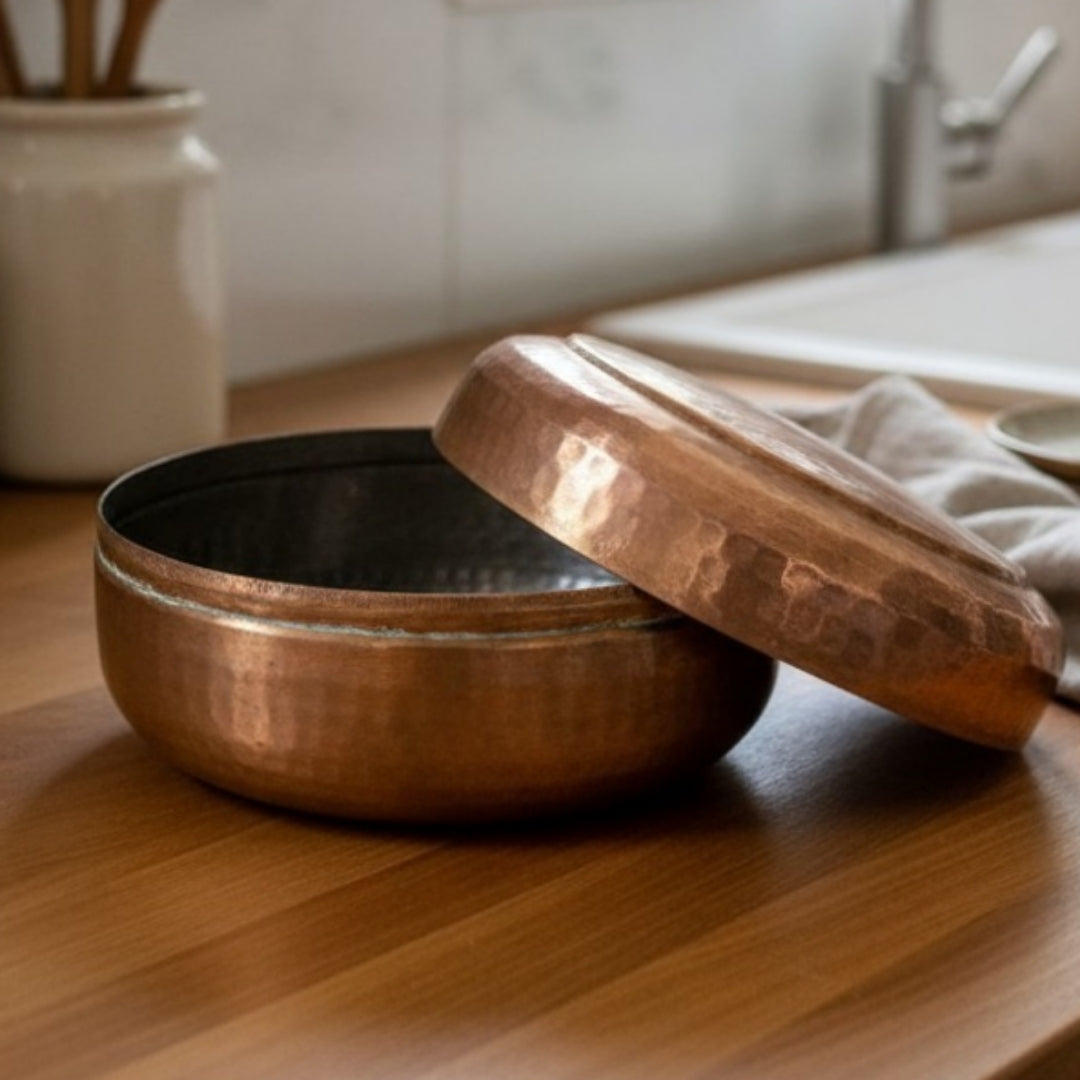 This chapati box is suitable for keeping rotis during meals, storing dry food items, or serving flatbreads directly on the dining table. When placed on kitchen shelves, dining consoles, or countertops, the warm brass tone adds a subtle decorative accent and a sense of traditional charm.