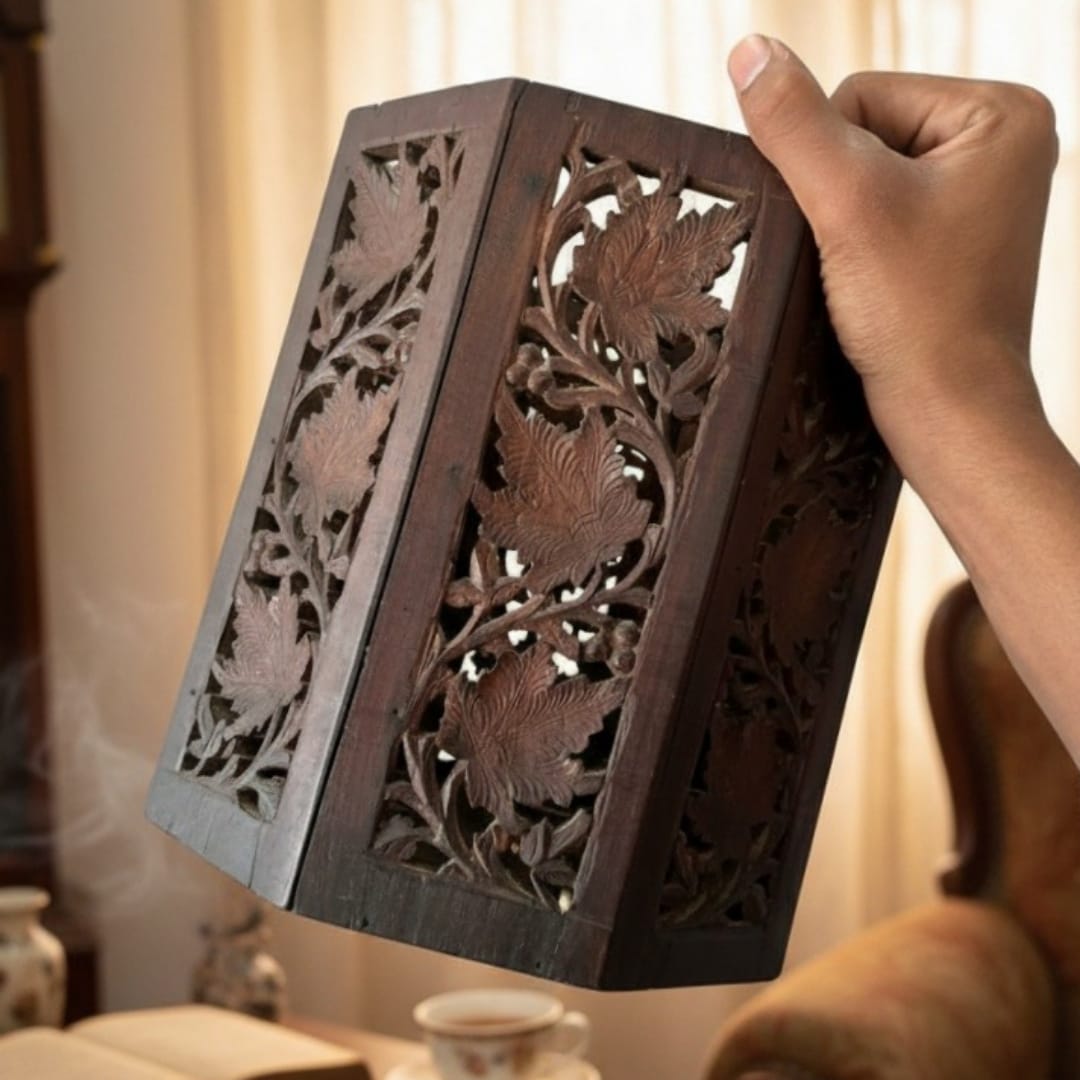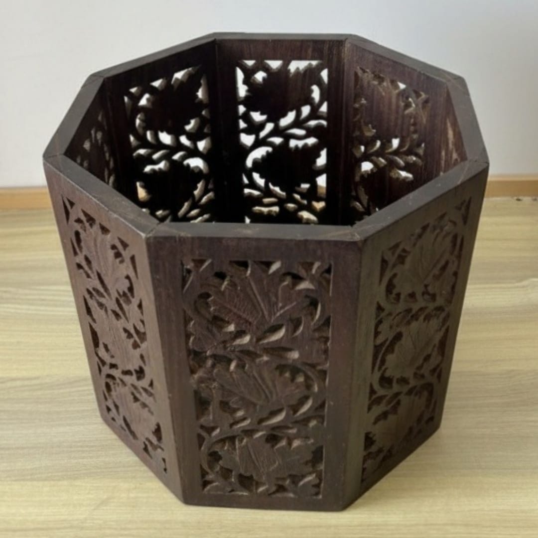 1979 Antique Teakwood Engraved Planter / Dustbin | Versatile Storage Container