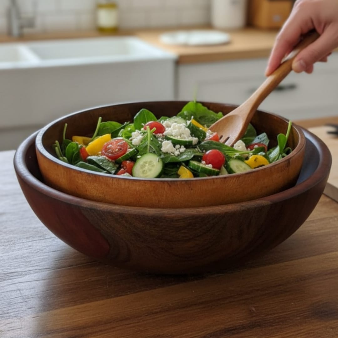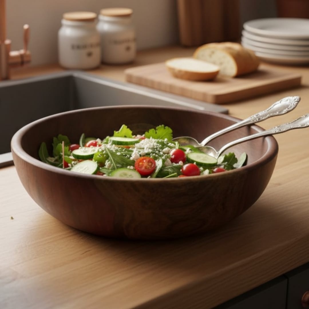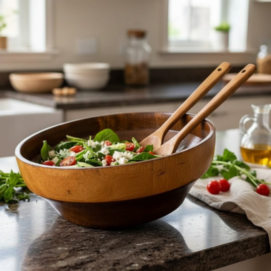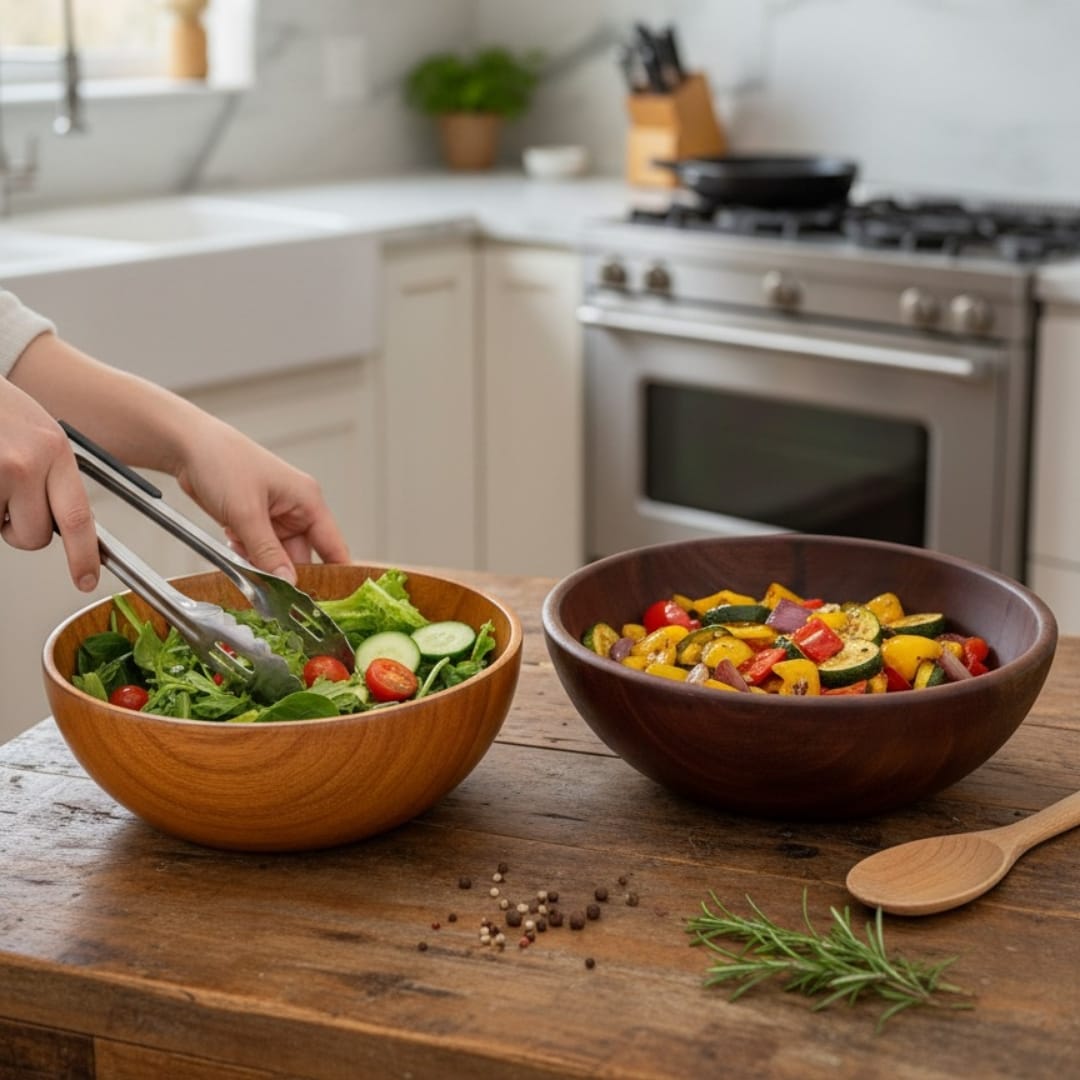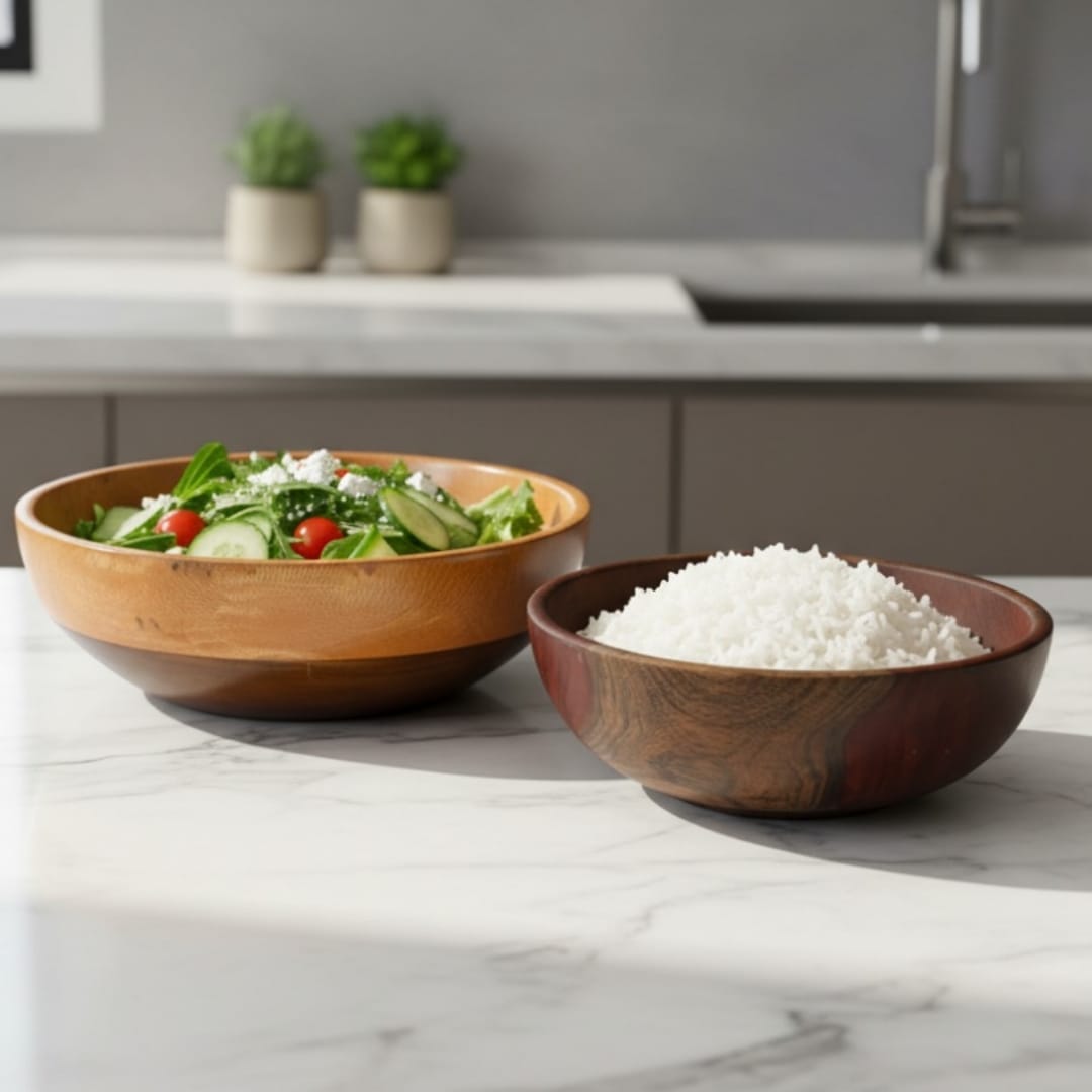 These bowls are suitable for serving salads, fruits, snacks, or family-style meals. The larger capacity allows them to hold substantial portions, making them practical for gatherings and dining setups. They can also be placed on kitchen islands or dining tables as natural wooden centerpieces.