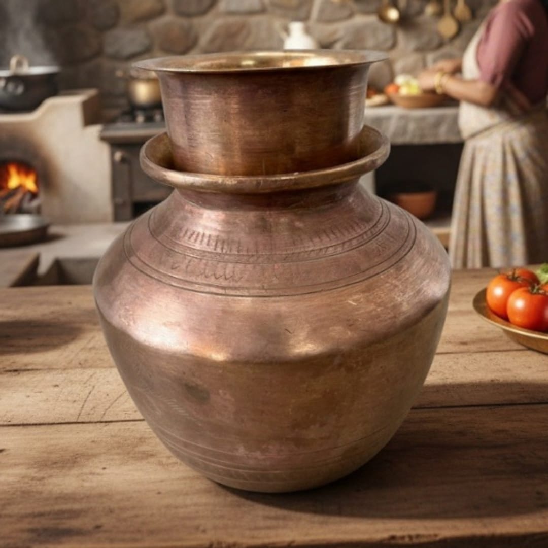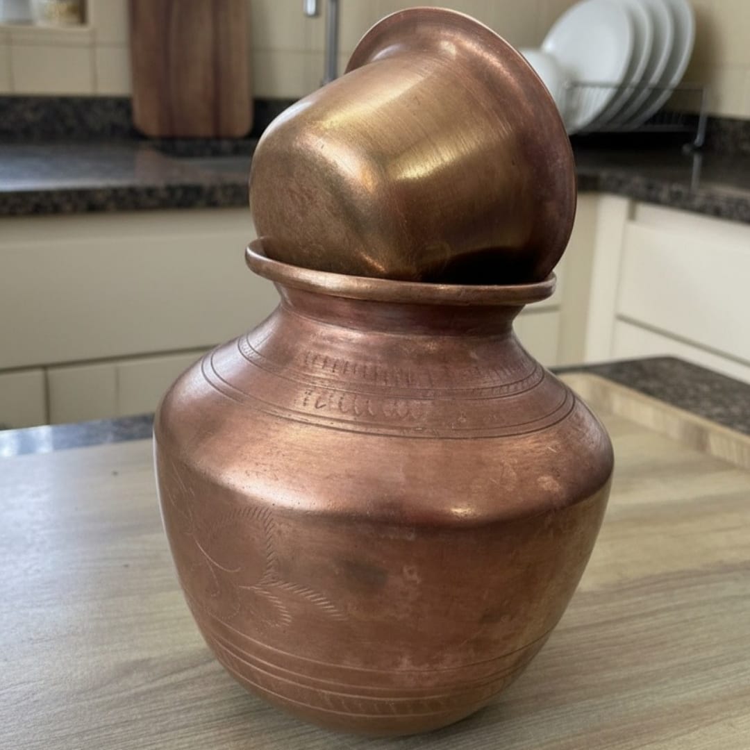 In everyday use, the kalash can hold water or liquids comfortably, with the pyala serving as a practical companion for pouring or serving. Style the set on kitchen counters, dining tables, or sideboards for a refined brass accent, or place it on open shelves as part of a metalware arrangement. It pairs well with wooden trays, stone elements, or other brass pieces, making it easy to integrate into both functional spaces and thoughtfully styled interiors.