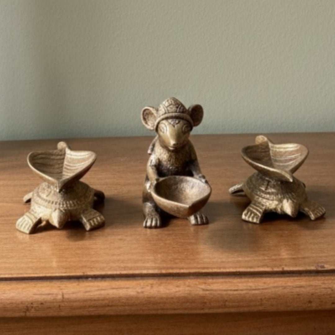 Made around 1980, this antique brass turtle and mouse diya set features four small, intricately shaped diyas crafted in solid brass with a naturally aged surface. The brass shows soft patina, tonal variations, and minor surface marks developed over time, reflecting functional household brassware from the late 20th century. Each piece combines charming animal forms with practical, shallow cavities for holding small items or wax.