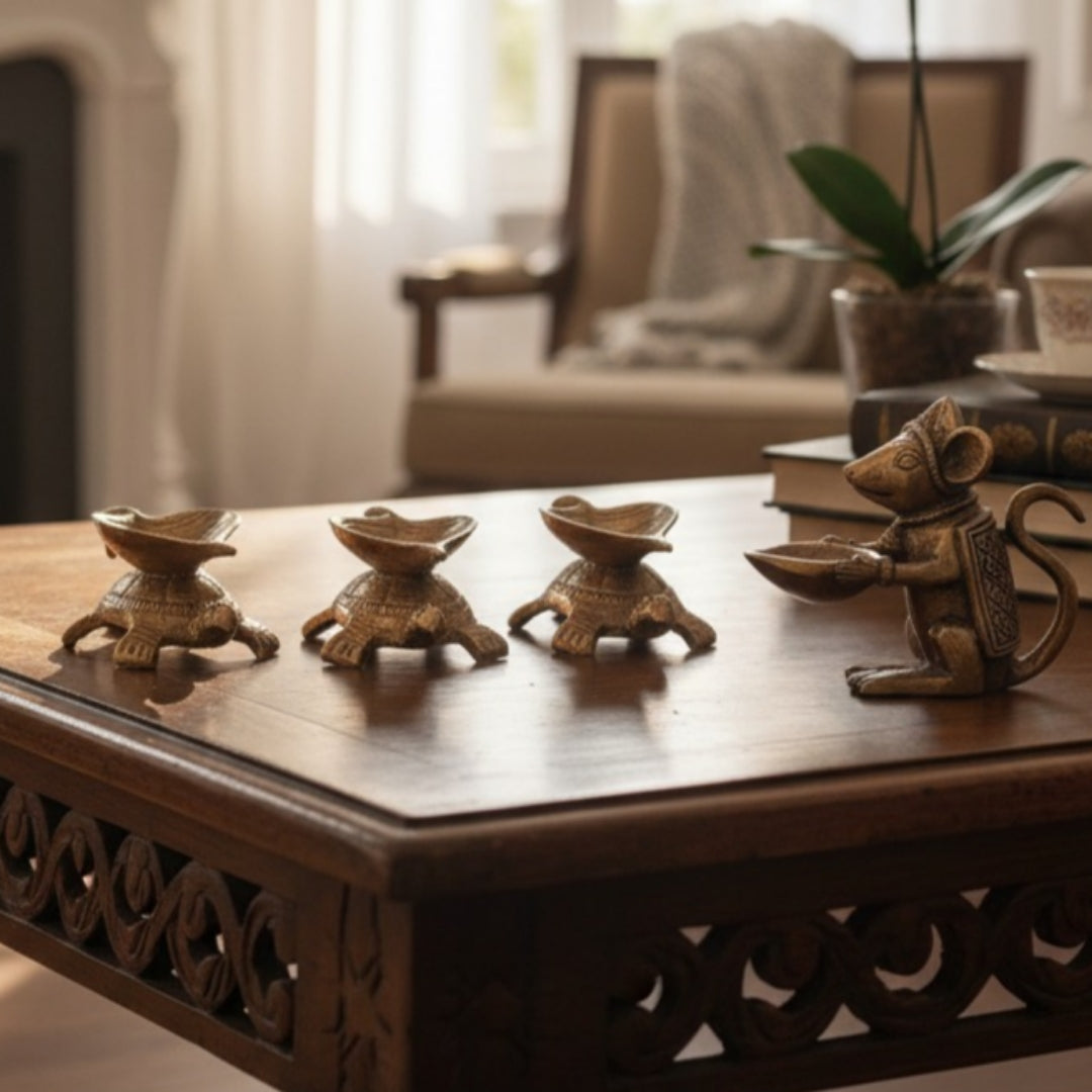 1980 Antique Brass Turtle and Mouse Diya Set of 4 | Small Brass Decor Accents