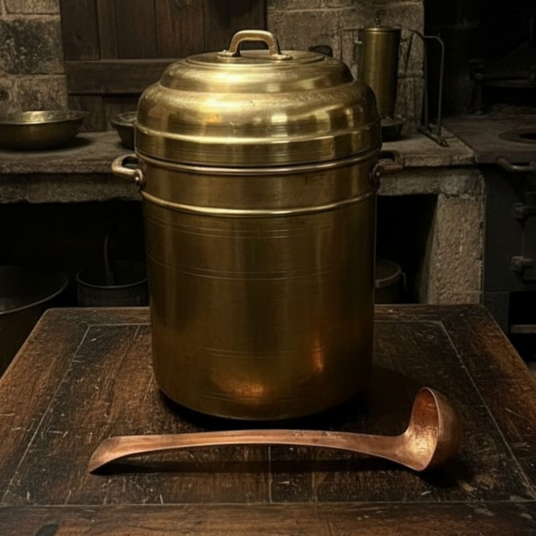 1981 Antique Brass Big-Size Steamer with Copper Ladle | Traditional Kitchen & Cooking Vessel