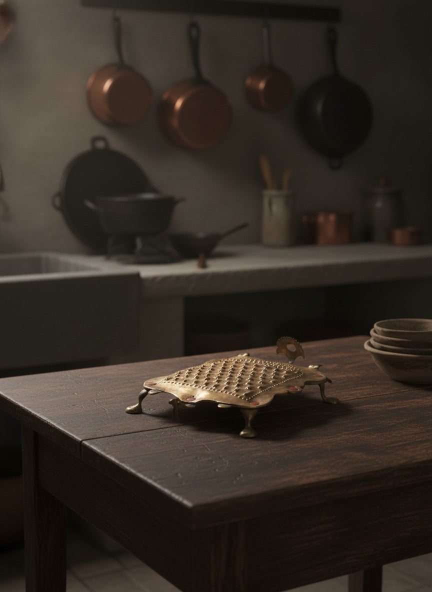 This 1981 antique copper grater carries the classic reddish-copper finish and sturdy build found in old traditional kitchens. Its wide surface and strong frame make it a functional utility piece as well as a striking decor element for shelves, counters, or kitchen-themed styling setups.