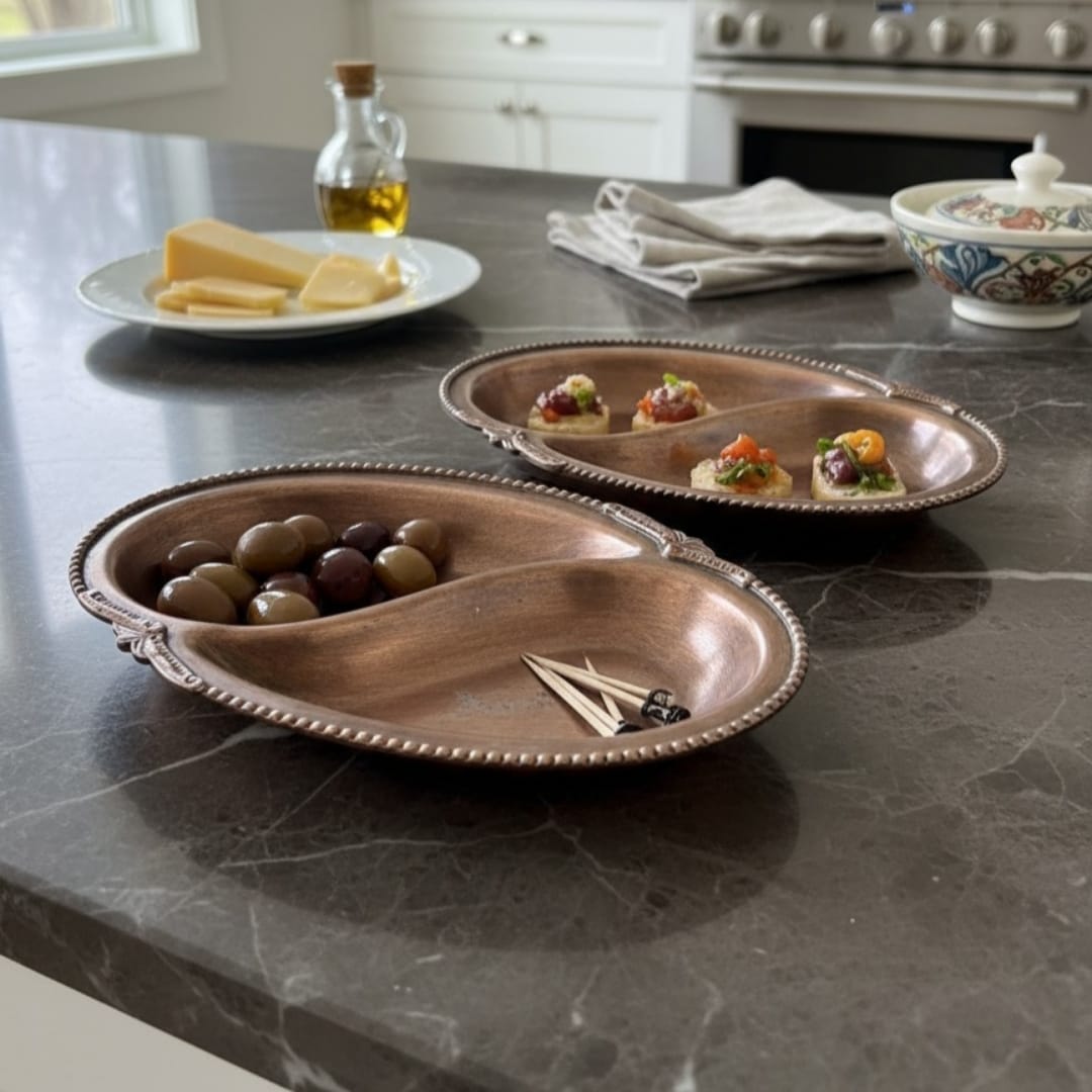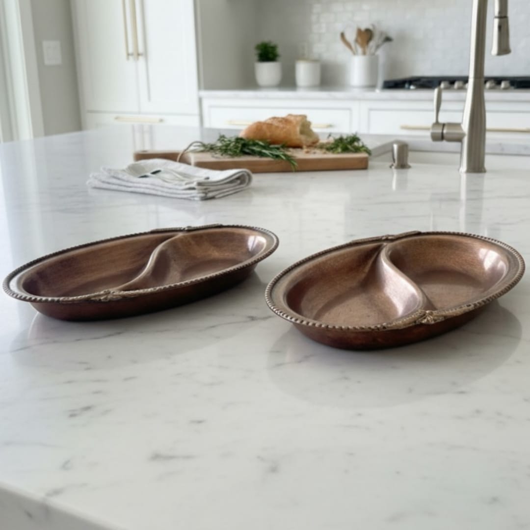 These brass sauce pans work well for serving gravies, chutneys, accompaniments, or small dishes during meals and gatherings. Their identical size allows coordinated table presentation, making them suitable for formal dining setups or everyday serving. When not in use, the pair can be placed on shelves or display surfaces, where the ornate borders and warm brass tone add an elegant decorative accent.