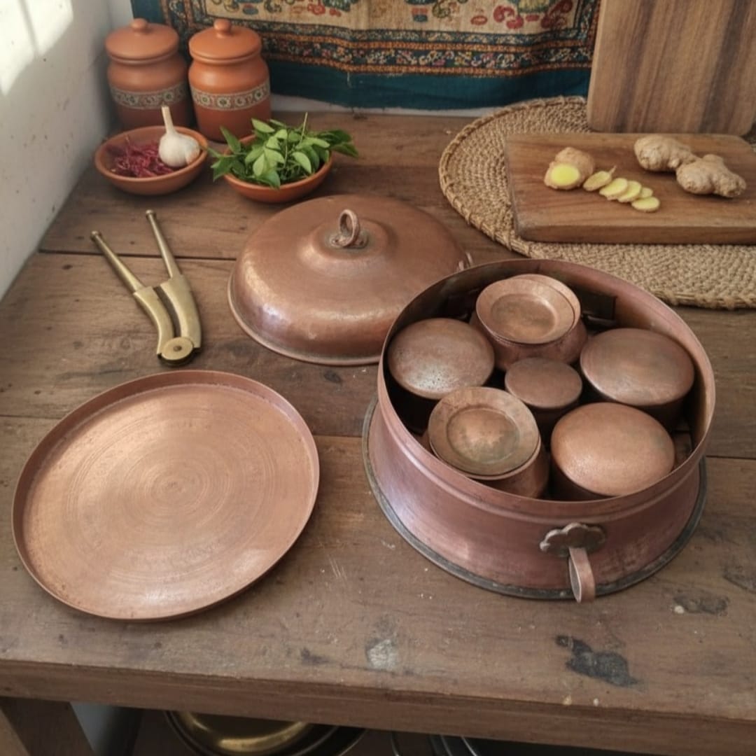 This paan dabba is perfect for storing small items such as nuts, spices, or keepsakes, and can also be used as a decorative container on tables or shelves. Its polished copper finish adds a warm, metallic accent to interiors, making it both a practical and visually appealing addition to your home décor.