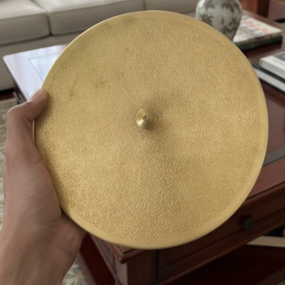 Made around 1983, this matching pair of antique brass flat storage boxes features a shallow, low-profile form with clean circular lines and a solid brass construction. The surfaces display a naturally aged brass tone with subtle marks and variations developed over time, reflecting functional Indian brassware from the late 20th century. The two sizes complement each other while maintaining a cohesive and balanced appearance.