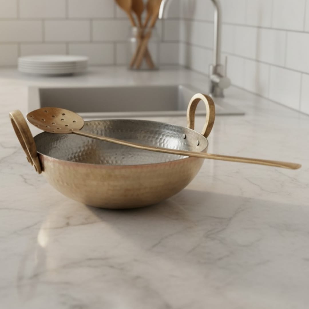 This brass kadai works well for frying, sautéing, preparing curries, gravies, or slow-cooked dishes that require even heat and space. The long ladle allows comfortable stirring and serving while keeping hands safely away from heat. When not in use, it can be placed on open kitchen counters or shelves, where its bold form and warm brass tone create a strong functional and visual presence.