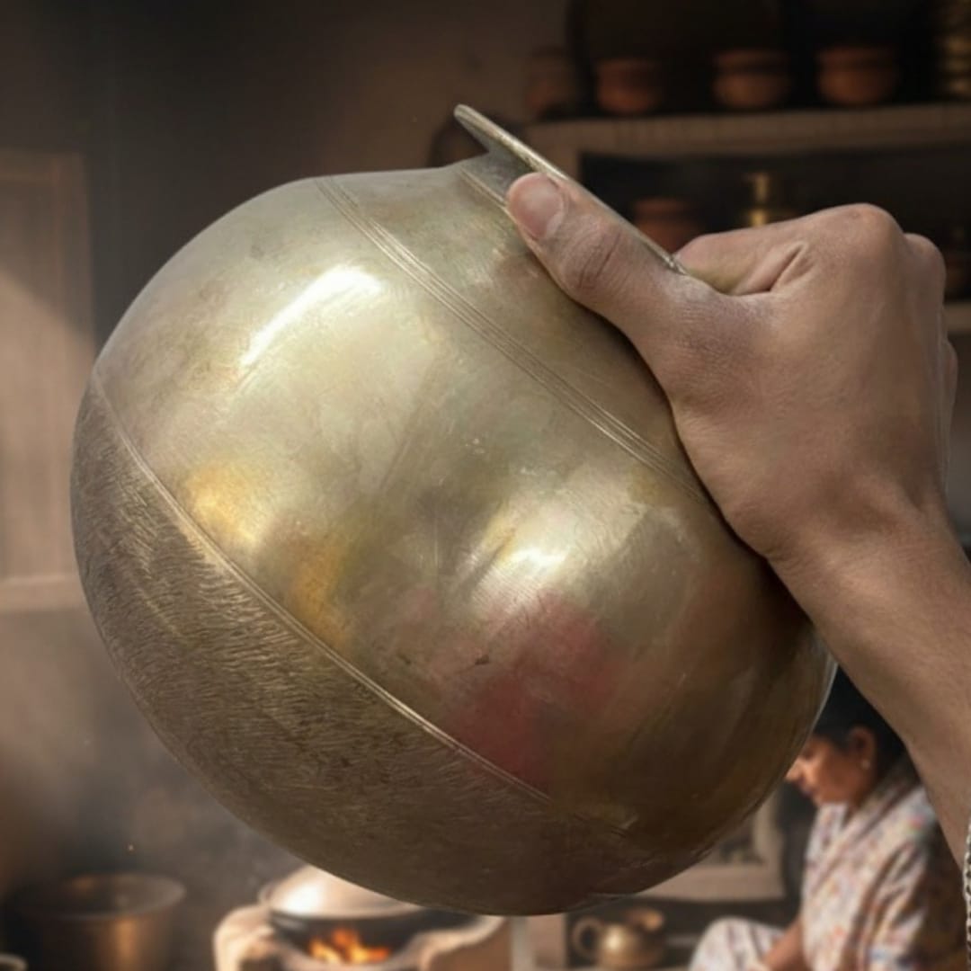 The elevated stand allows the pot to be placed securely for cooking or table presentation, while the ladle and lid complete the functional setup. This antique bronze cooking bowl set can be used for traditional preparations, festive setups, or displayed as a heritage kitchen centerpiece.