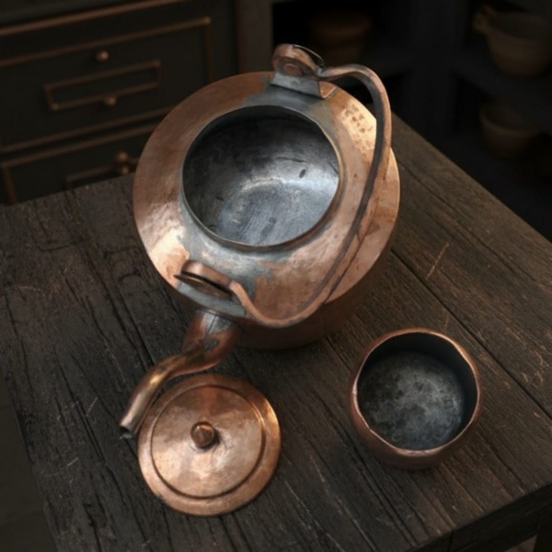 The kettle can be used for serving water, herbal brews, or warm beverages, while also working beautifully as a display accent in kitchens, dining setups, or themed hospitality spaces. Its thoughtful pairing and classic finish make it a functional and decorative collectible for curated interiors.