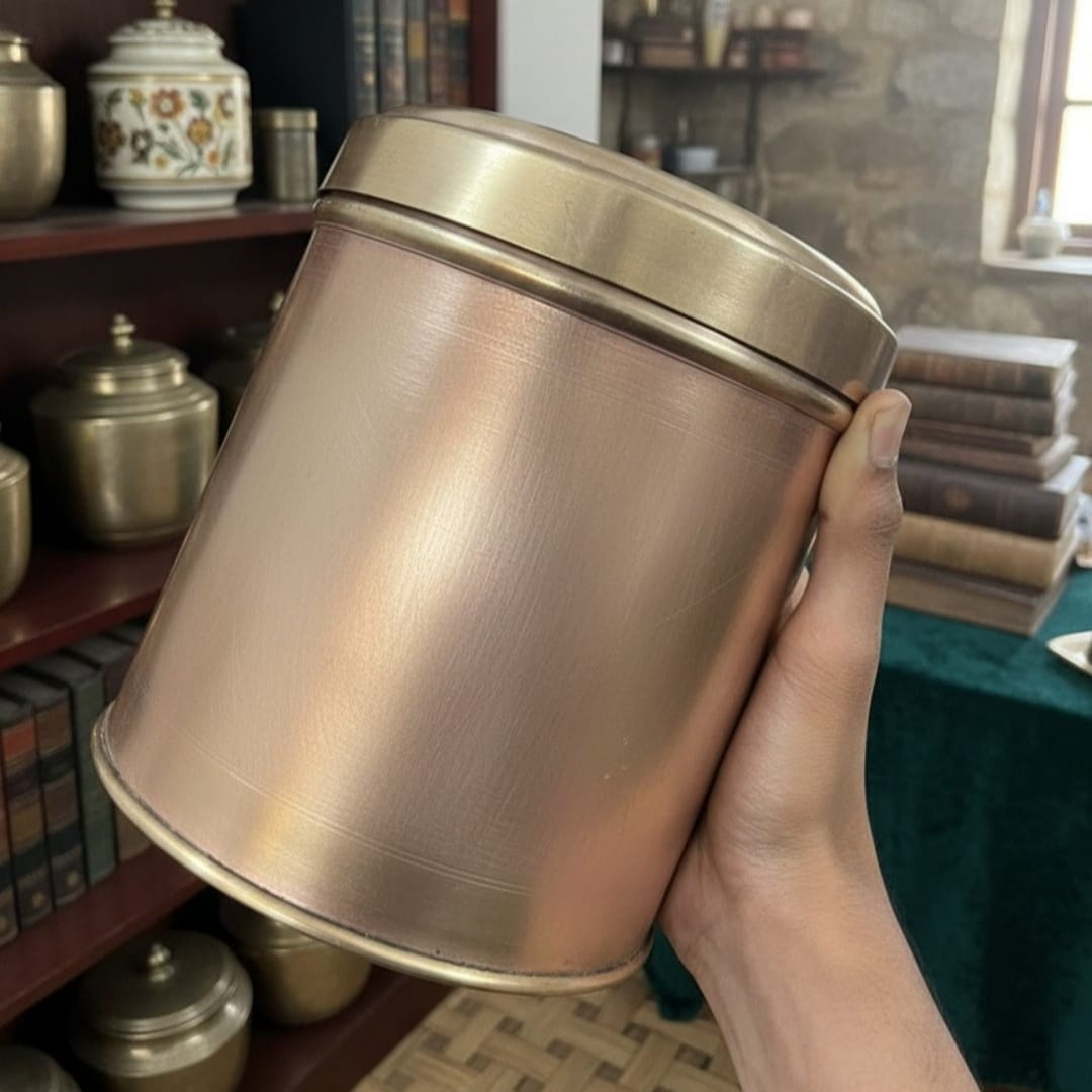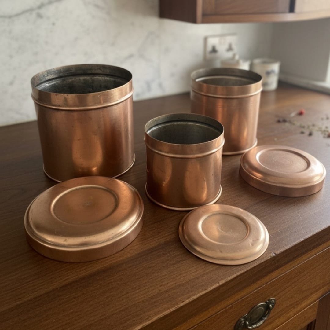 Crafted around 1985, this antique brass pedi kati box set of three features a graduated nesting design with intricate surface detailing and a warm patina that has mellowed beautifully over time. Each box shows subtle aging variations, gentle wear patterns, and rich tonal depth that highlight its authentic origins and enduring metalwork quality. The largest outer box protects the two smaller inner ones, creating a practical yet elegant storage solution with heirloom character and substantial presence.