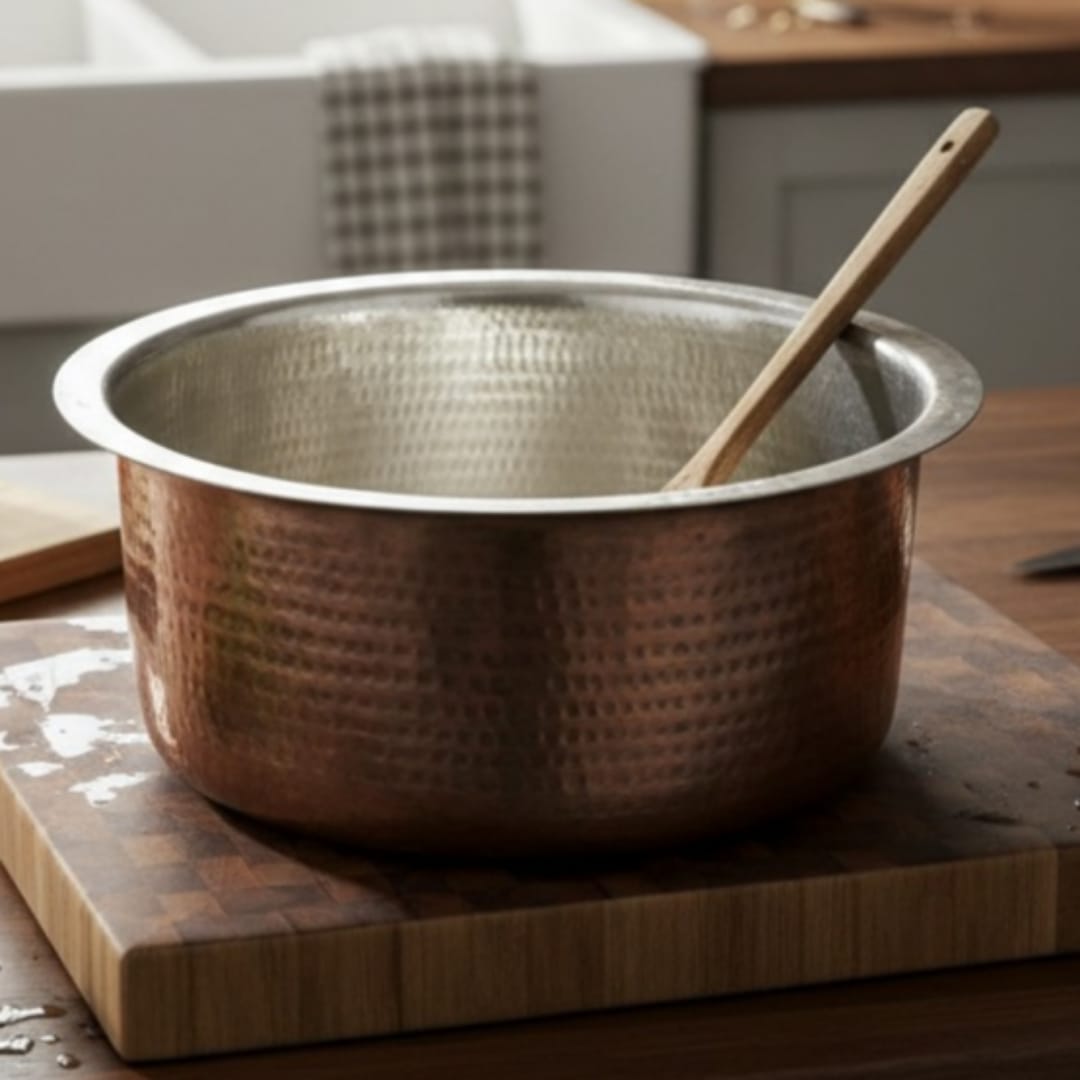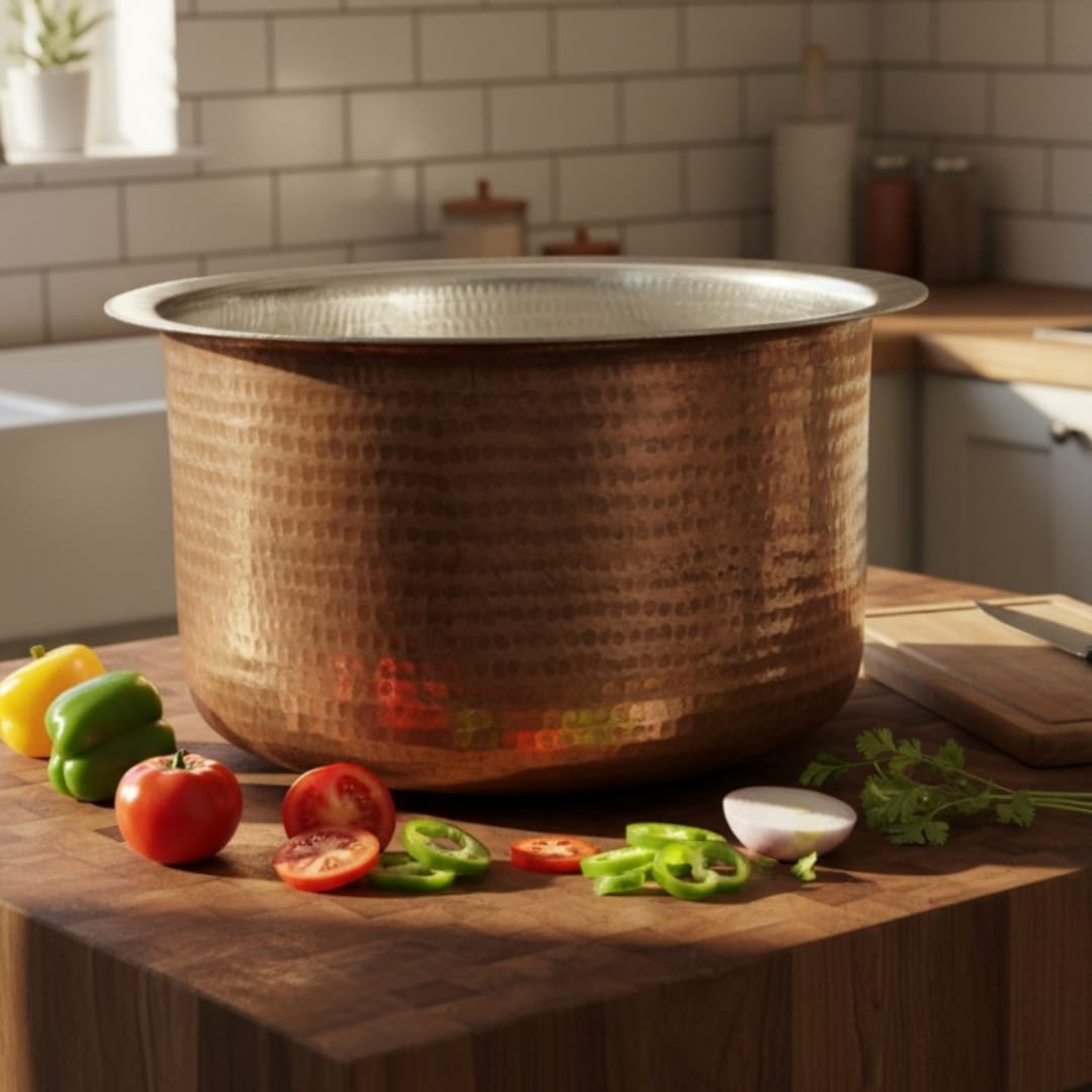 This large brass deg works well for preparing bulk quantities of food, slow-cooked dishes, boiling liquids, or extended cooking processes that require space and stability. The wide diameter allows easy stirring and handling, making it suitable for home kitchens, catering environments, or large cooking setups. When placed in open kitchens or display areas, its scale and aged brass finish create a strong functional and visual presence.