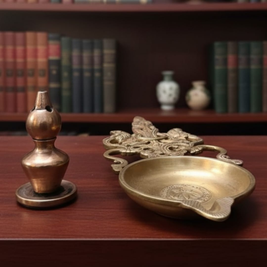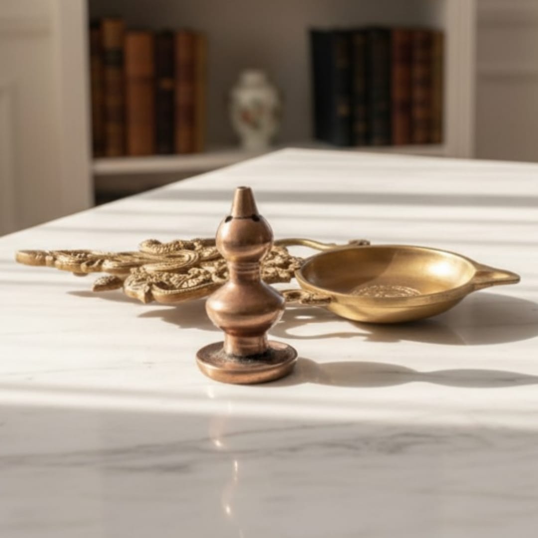 This piece can be used as a decorative lighting and fragrance accessory in indoor spaces. It works well on console tables, shelves, or display units, where it adds a warm brass accent and visual interest. When not in active use, it functions effectively as a display object, showcasing engraved brass detailing and traditional metal artistry without requiring functional placement.