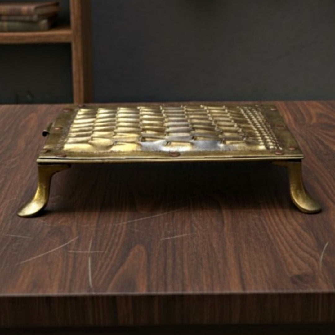 This 1986 antique brass grater reflects the functional beauty of traditional Indian kitchenware. Designed for grating and grinding in early household setups, it showcases a sturdy brass build with an aged patina that adds to its authentic charm. Its compact size and fine detailing make it a distinctive reminder of India’s rich culinary heritage.