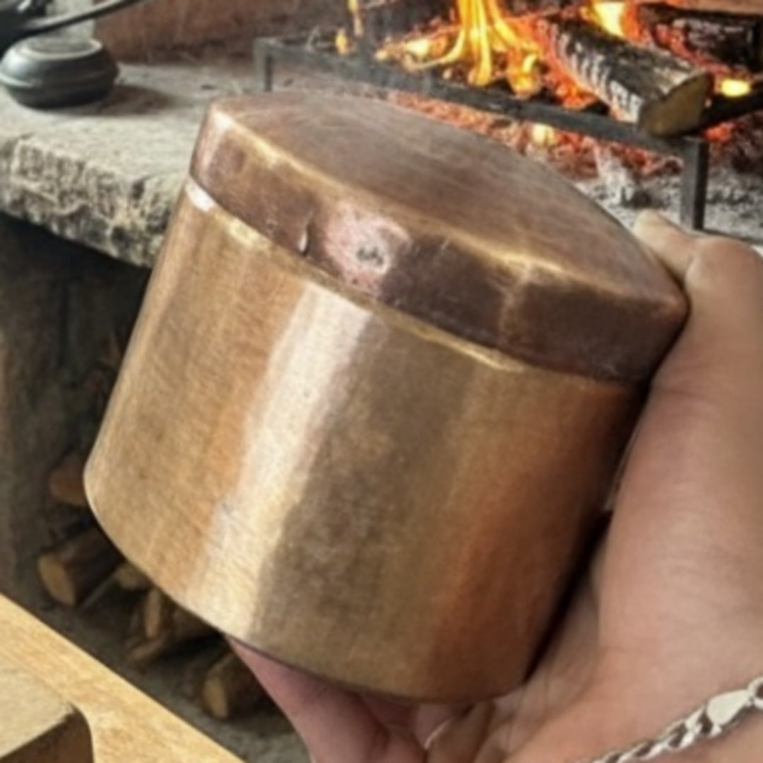 Made around 1986, this antique brass storage box features a deep circular form with a fitted lid, crafted in solid brass and finished with a naturally aged surface. The brass shows soft patina, tonal variations, and light surface marks developed over time, reflecting functional Indian household brassware from the late 20th century. Its sturdy construction and well-balanced proportions make it suitable for regular kitchen handling.