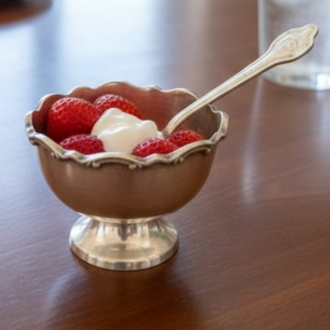 Made around 1988, this antique brass dessert set includes a proportionate cup, matching plate, and coordinated spoon. The balanced cup depth and wide plate surface reflect structured serving ware commonly crafted during the late 1980s. The uniform brass finish across all three components creates a cohesive presentation.