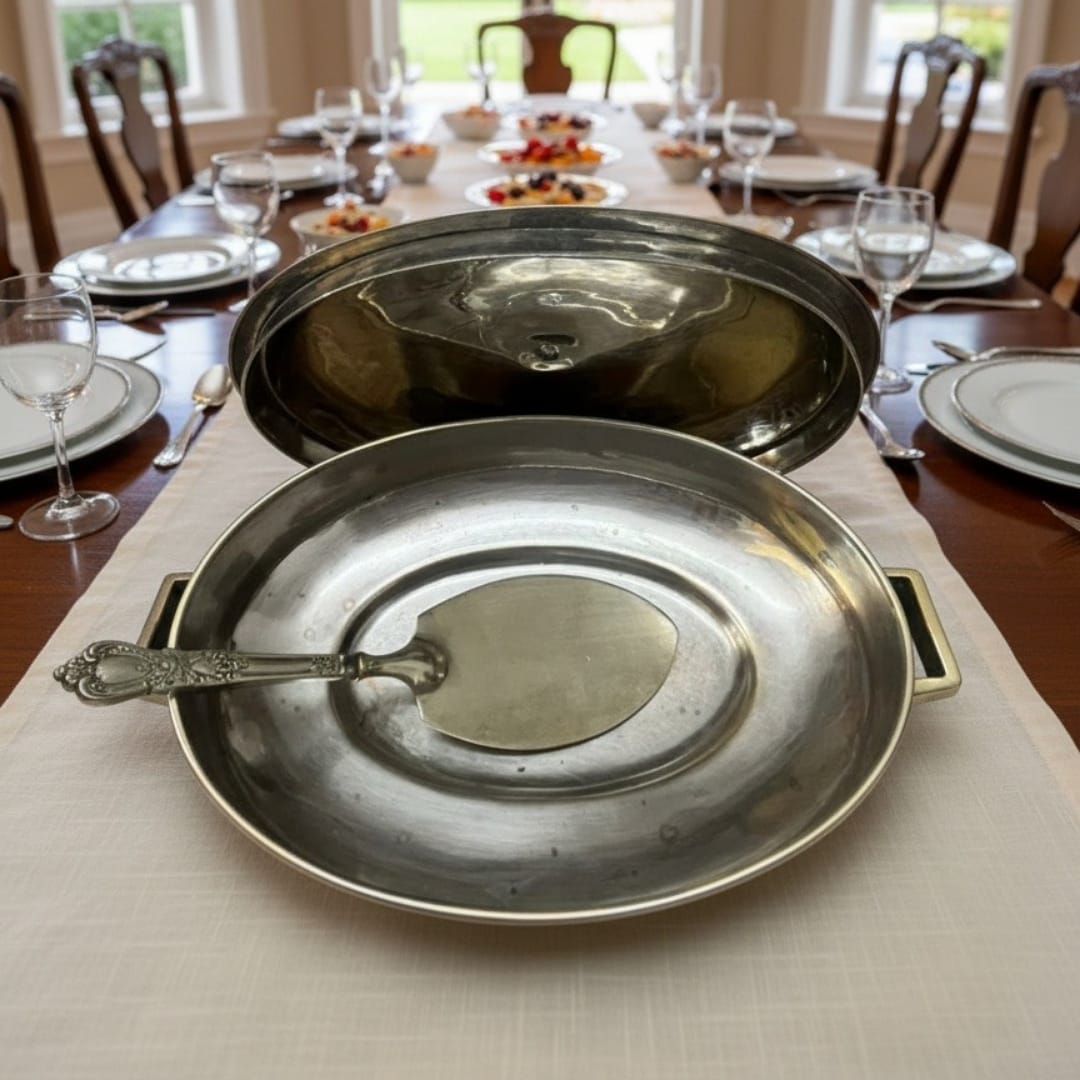 Crafted in 1989, this antique brass dish with lid and ladle presents a wide shallow serving form with fitted cover and matching utensil, developing rich patina from decades of household use and gentle handling. The spacious interior and sturdy ladle show subtle residue traces while exterior surfaces reveal polished edges and warm color gradients that emphasize durable construction and generous proportions. Balanced design and substantial weight make it ideal for centerpiece display or tabletop organization.