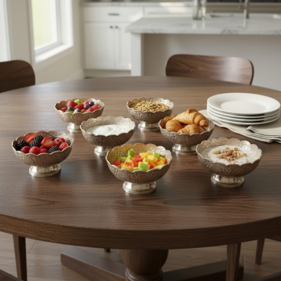 These bowls are suitable for decorative styling on coffee tables, dining tables, console units, or shelves. They can be arranged together as a grouped display or placed individually across different spaces to create a coordinated interior look. Their engraved finish and silver-toned surface allow them to function purely as décor accents, adding elegance and character to both modern and traditional interiors.