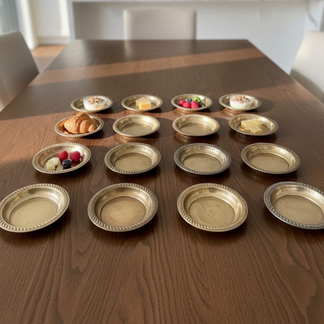 These vati bowls are suitable for serving individual portions such as curries, dals, vegetables, condiments, or accompaniments during meals. They can be arranged on dining tables or serving trays for everyday use and larger gatherings. When not in active use, the bowls can be stacked or placed on open shelves, adding a classic brass presence to the dining area while remaining fully functional.
