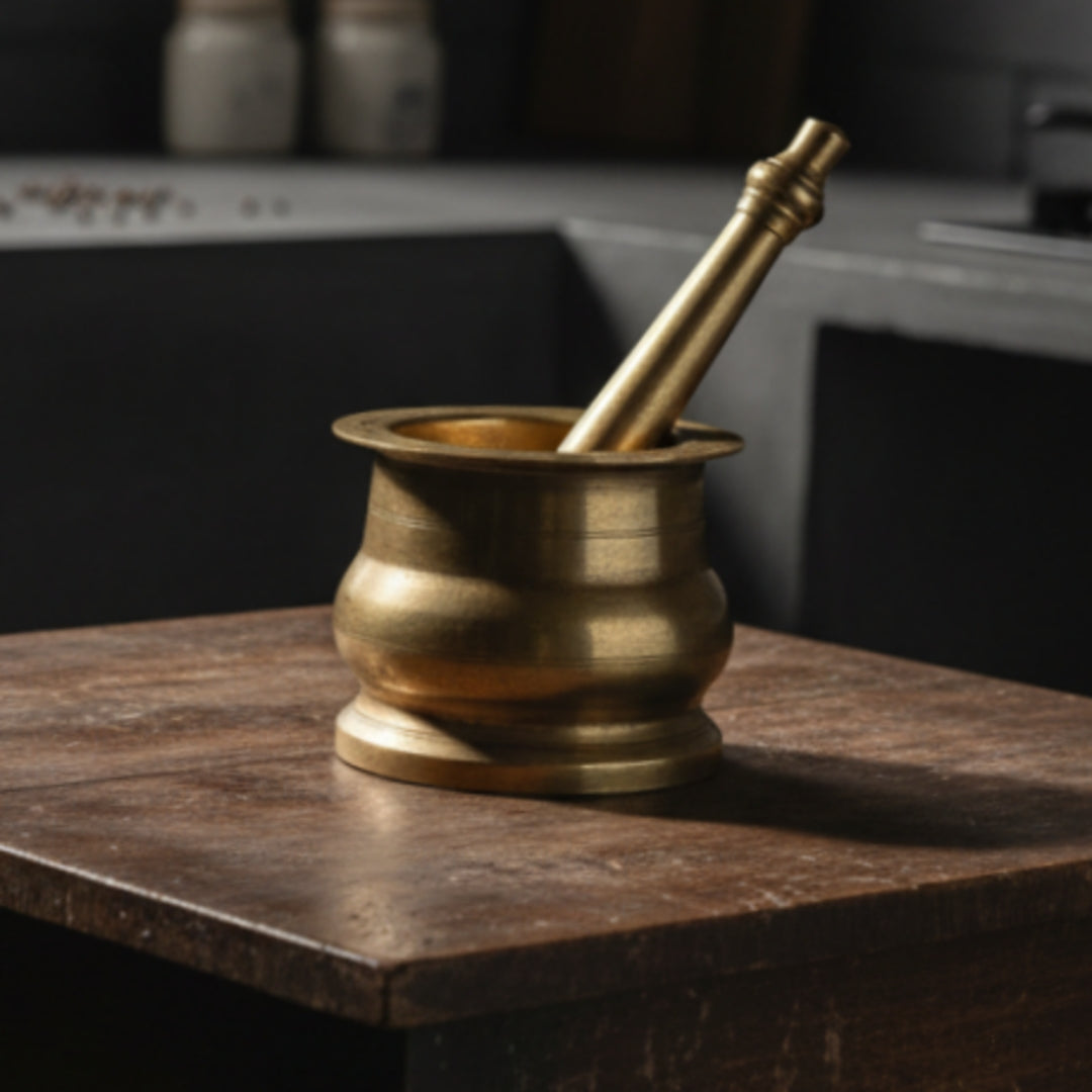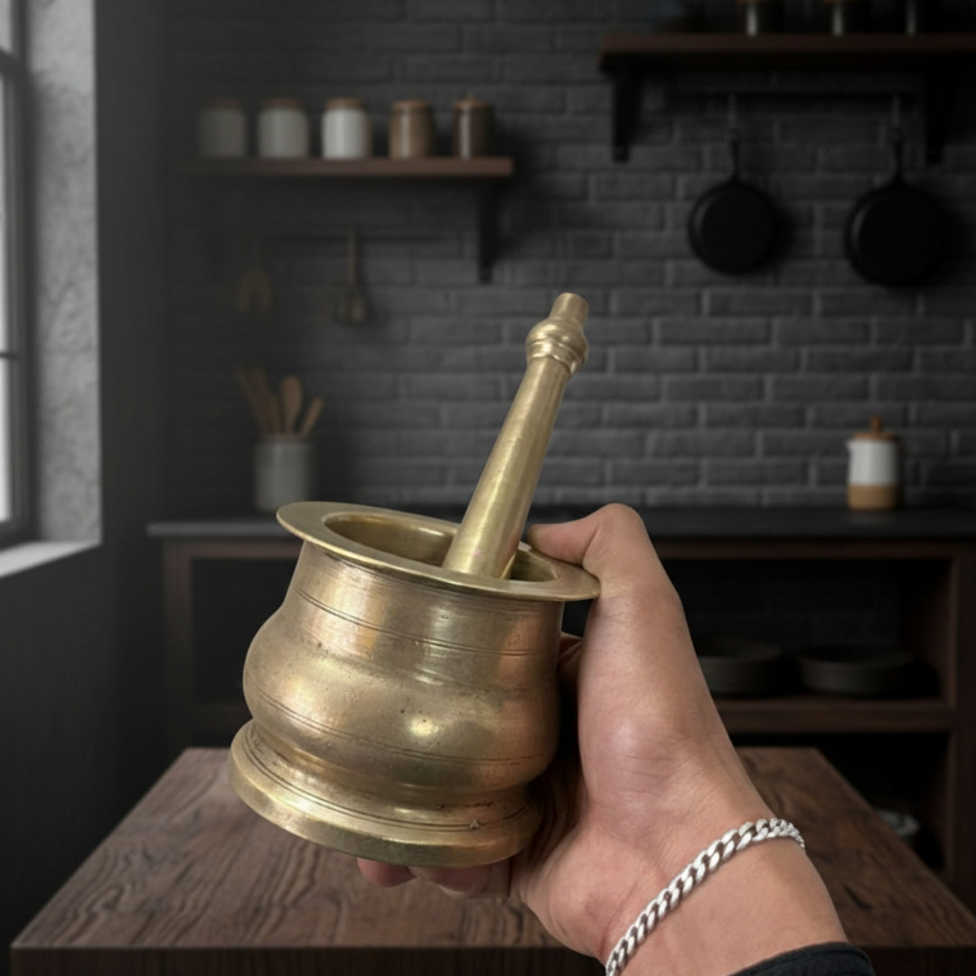 This 1990 antique brass khalbatta was once a daily-use tool in Indian households for grinding spices, herbs, and grains. Crafted from thick, solid brass, it showcases the strength and endurance of traditional kitchenware, designed to last for generations while retaining its authentic patina.