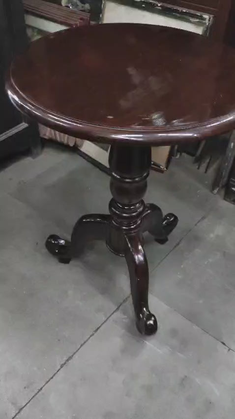 Crafted around 1994, this antique teakwood table showcases a circular top supported by a finely turned pedestal with curved tripod-style legs, reflecting timeless furniture styles of the early 1990s. The smooth finish and sculpted base give it a distinctive and elegant presence.