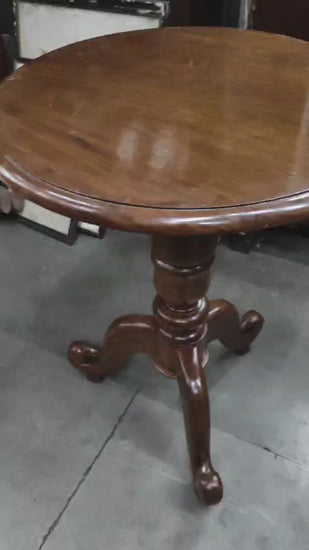 Made around 1994, this antique teakwood side table features a circular top supported by a central pedestal base with curved legs, reflecting classic furniture designs from the early 1990s. The turned column and sculpted legs create a balanced and elegant structure.