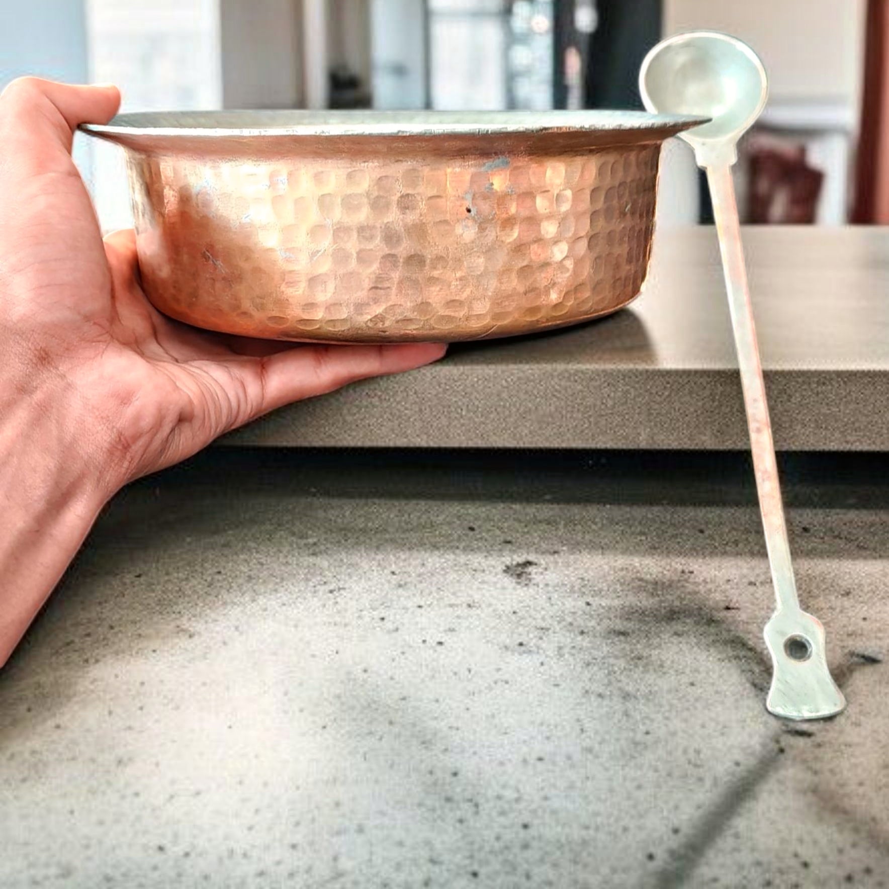 Heavy-gauge antique brass deg paired with a long pital ladle — a timeless utility from traditional Indian kitchens. The wide form and durable build make it ideal for rustic cooking, kitchen styling, or folk art-inspired setups. A versatile addition for both functional and decorative use.