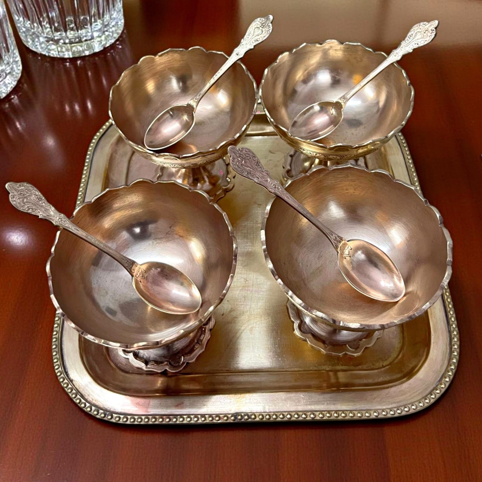 Antique Brass Dessert Set | Traditional Serving Set with Tray & Spoon