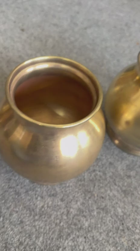 This antique brass set includes two kalash vessels of matching size, reflecting traditional brass forms commonly produced during the early 1970s. The 5 inch diameter and 5.5 inch height create a balanced and well-proportioned structure.
