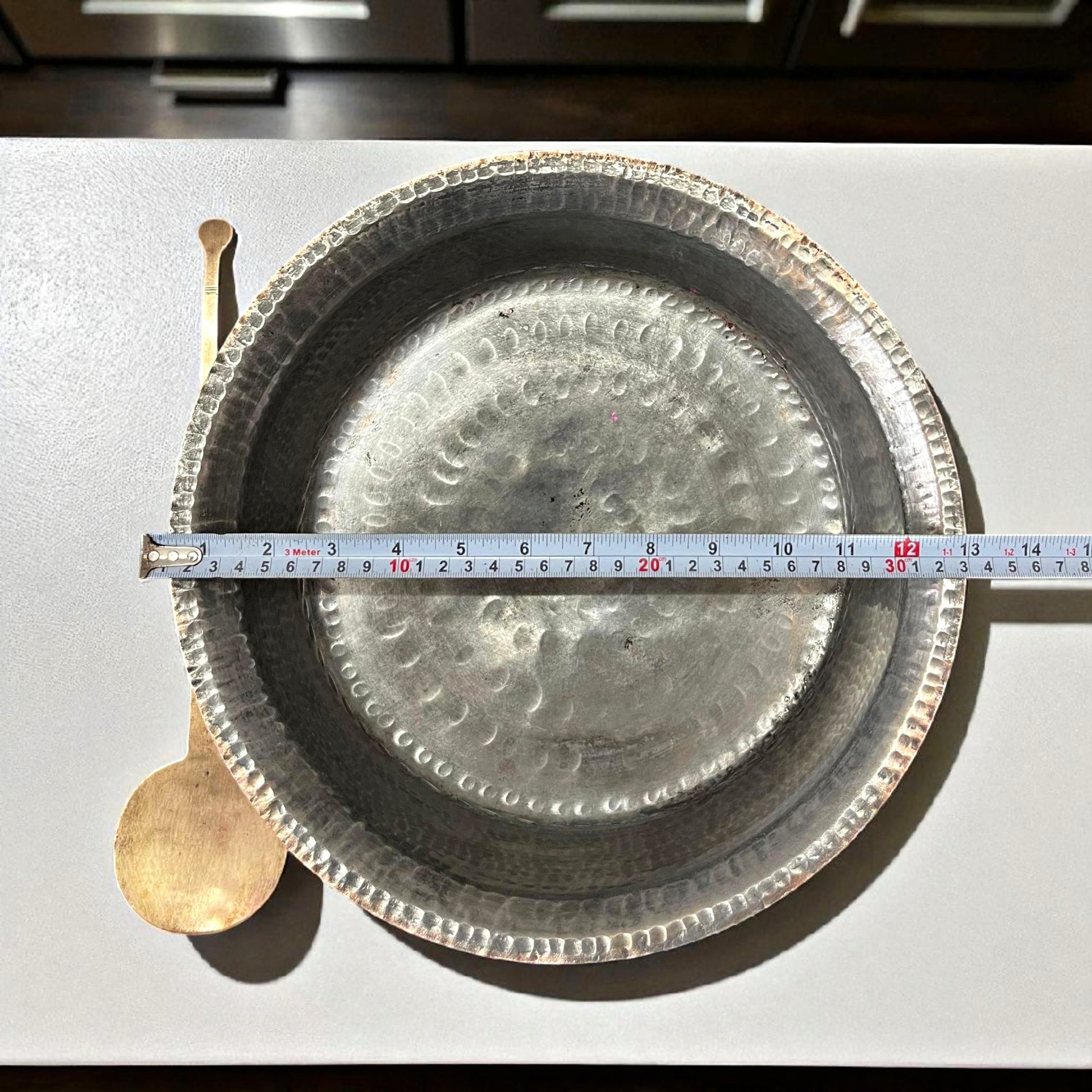 Traditional pital langdi used for slow cooking and large-batch preparation. Its broad base and heavy brass body ensure even heating, while the long brass spoon adds utility and charm. Perfect for functional kitchen use, heritage cooking setups, or folk art-inspired decor.