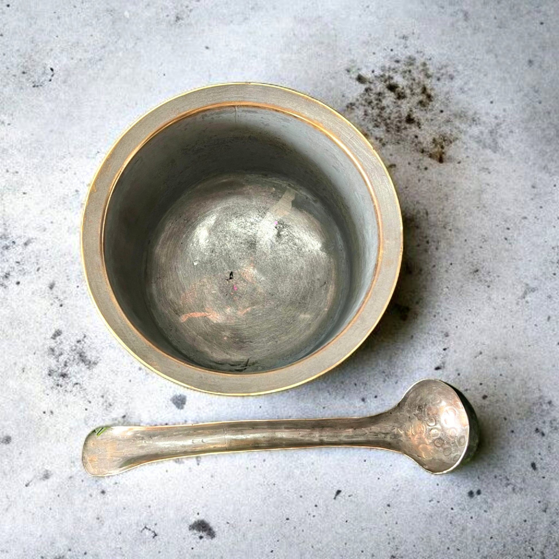 A classic antique brass bowl paired with a matching ladle, perfect for traditional cooking, serving, or kitchen storage. The brass construction offers both durability and heritage charm, making it a versatile choice for functional use, decor styling, or gifting.
