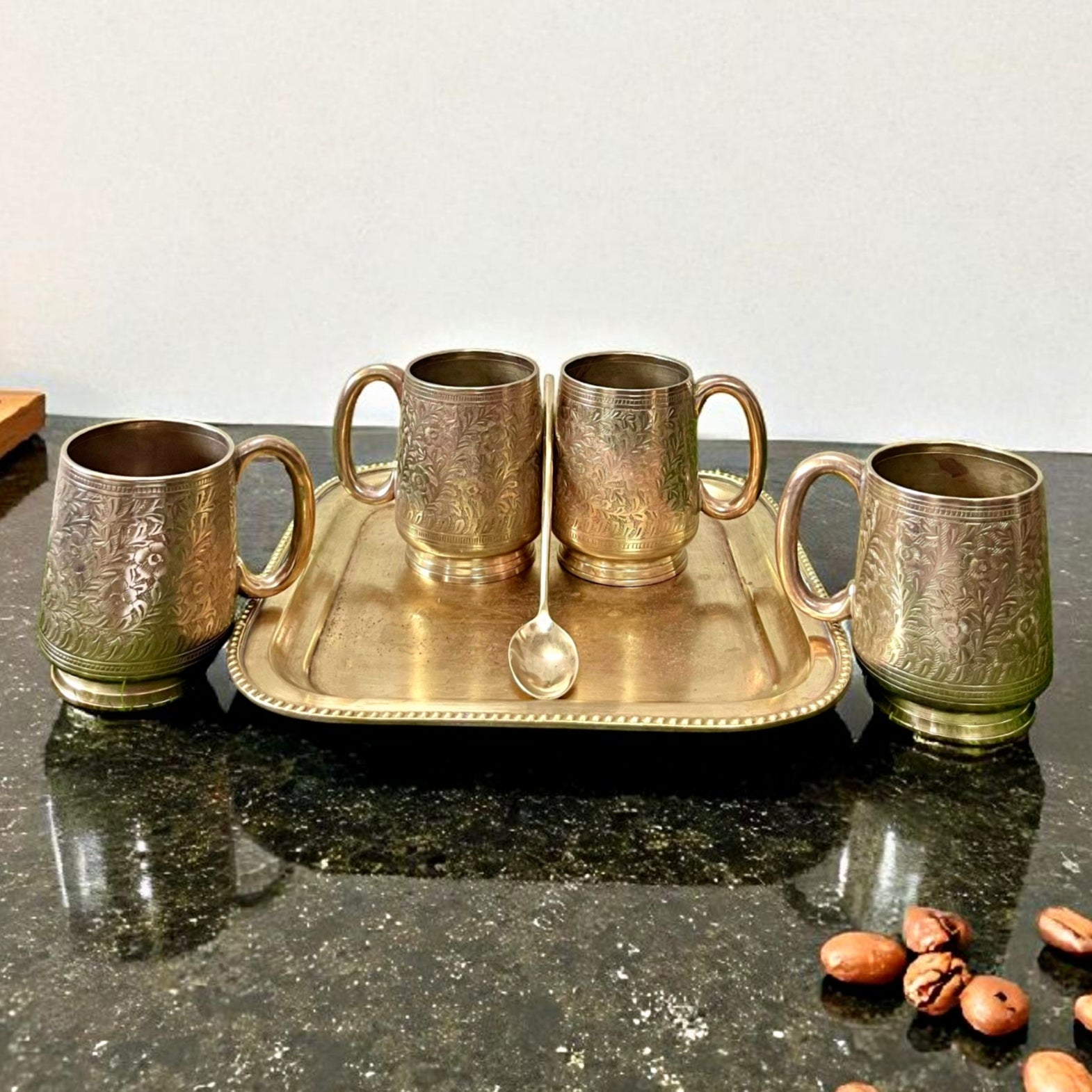 A premium antique brass mug set featuring four matching mugs, a broad serving tray, and coordinated spoons — all showcasing a beautiful aged brass finish. This set captures the essence of traditional Indian serveware, blending elegance with cultural heritage.
