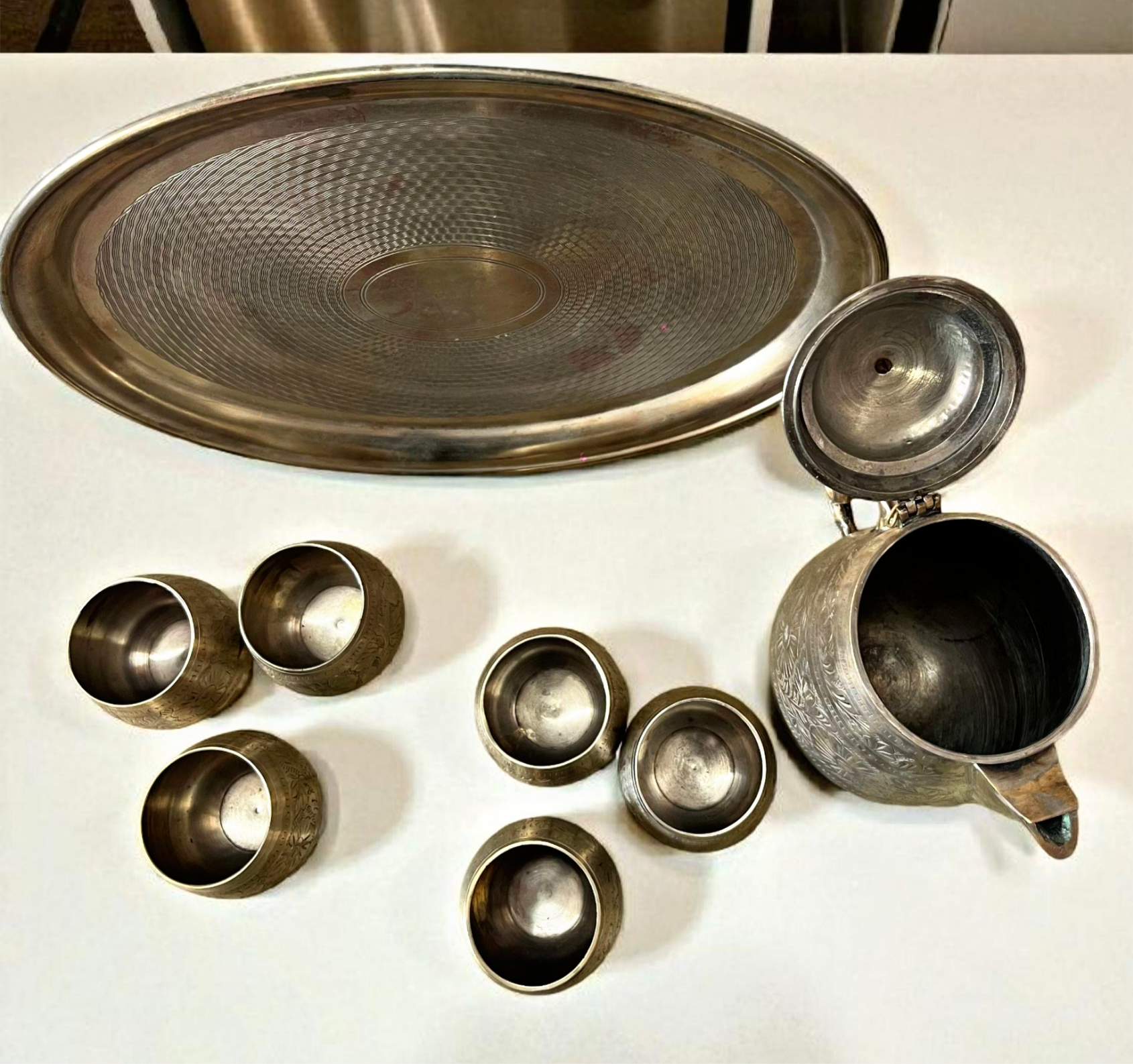 An elegant antique brass refreshment set featuring a traditional jug, matching glasses, and a wide tray — all showcasing a beautiful aged brass patina. The set reflects timeless Indian serveware design that adds character and heritage to your dining or display setup.