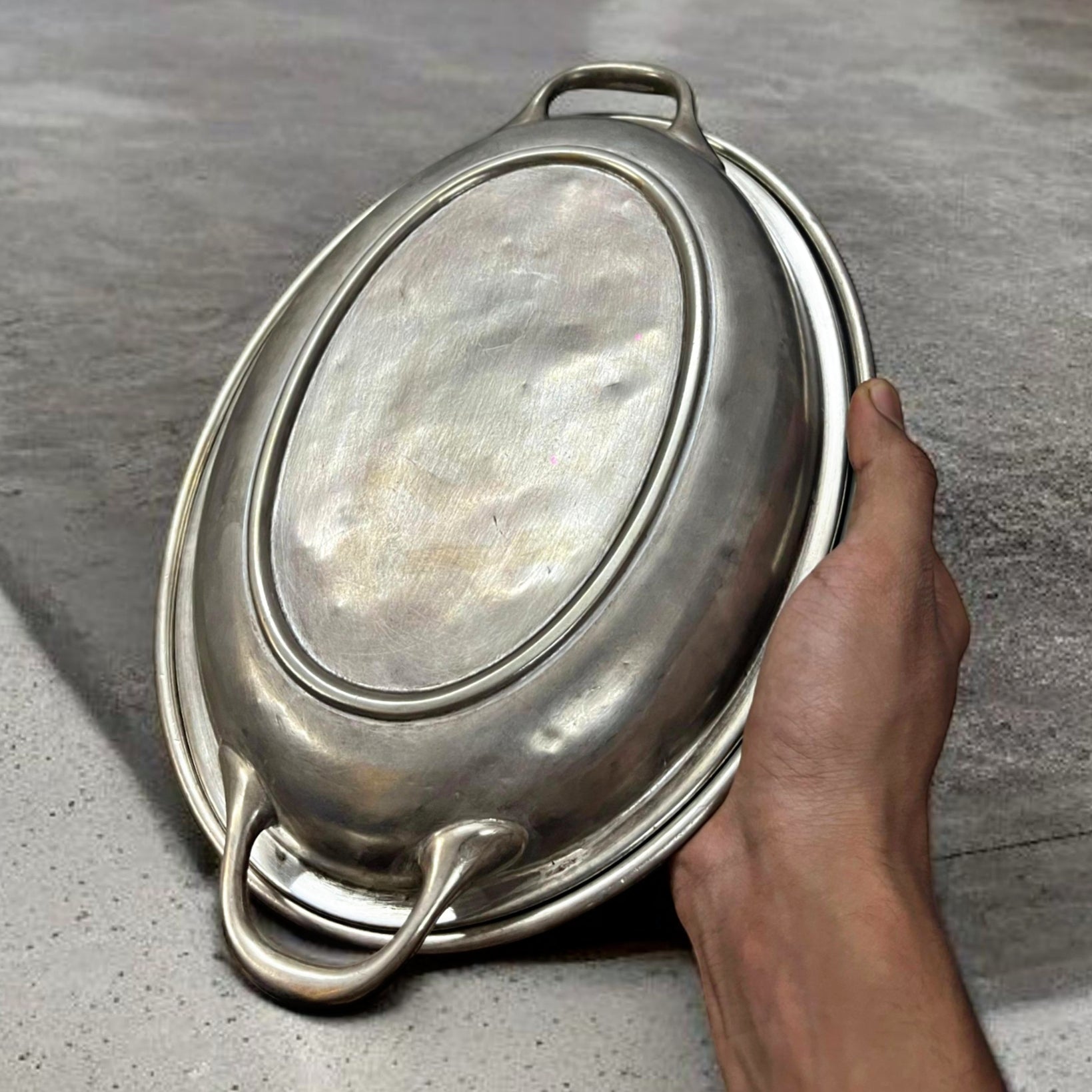This antique brass silver coated dish comes with matching spoons and lid, reflecting timeless Indian artistry. Ideal as heritage serveware for sweets, dry fruits, or festive treats, it also doubles as a traditional brass decor item for homes and restaurants. The elegant silver coating adds a premium touch, making it perfect for table styling, gifting, and display in vintage-inspired spaces.