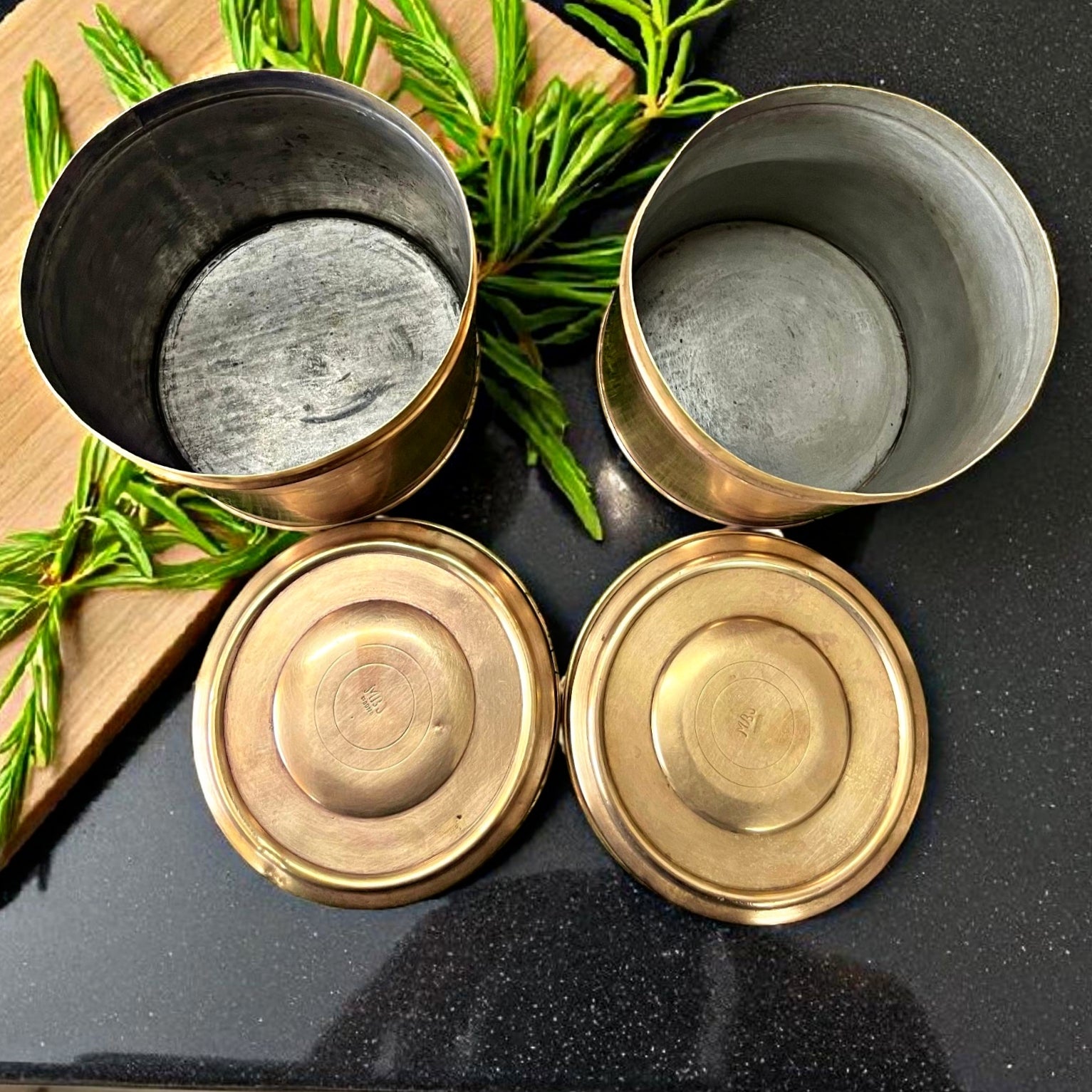 A stunning pair of antique brass storage boxes featuring a rich golden patina and sturdy construction. Their spacious, round design captures the elegance of traditional Indian kitchens while offering versatile utility for modern homes.