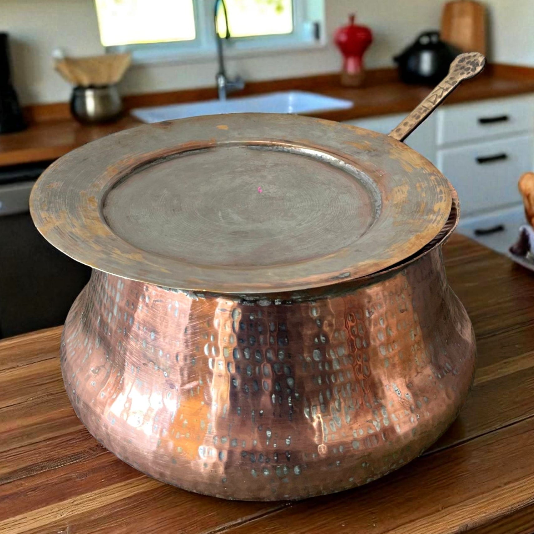 This antique copper deg comes complete with its original lid and long ladle, reflecting the robust utility of traditional Indian cooking vessels. Perfect for showcasing as a rustic centrepiece or using for folk-style food styling, this set stands out in heritage kitchens, brass-copper décor corners, or café setups rooted in old-world charm.