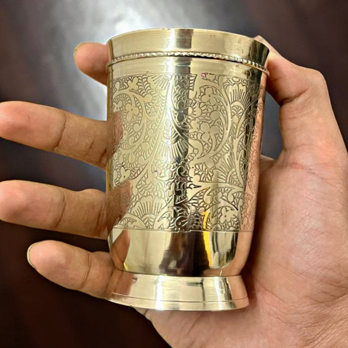 This brass engraved refreshments set features a beautifully detailed jug paired with matching glasses, showcasing fine engraving and a polished golden finish. The intricate motifs enhance its rich traditional look, while the solid brass construction ensures lasting durability and elegance.
